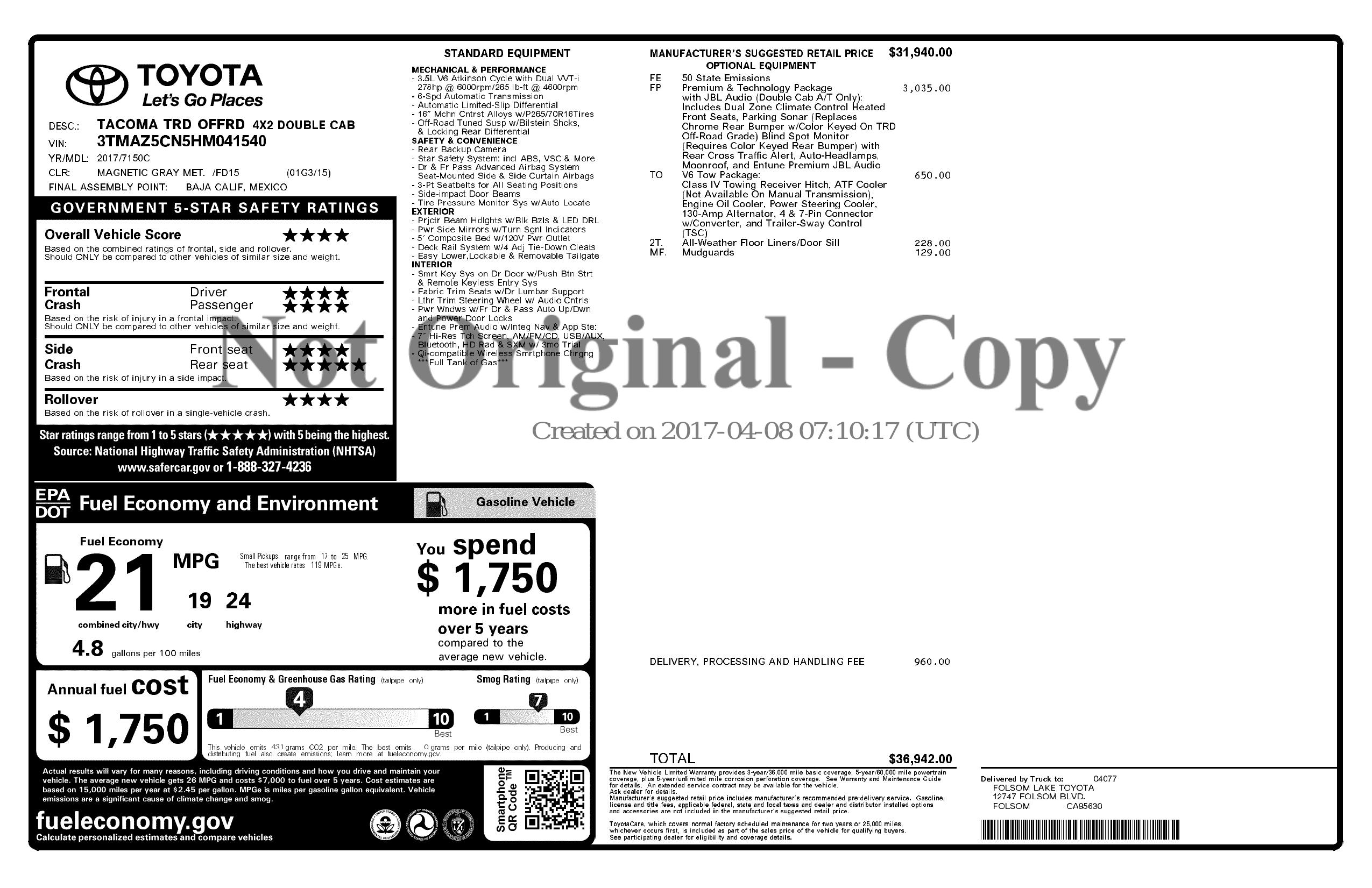2017 Toyota Tacoma Double Cab 5' Bed V6 4x2 At (Natl)