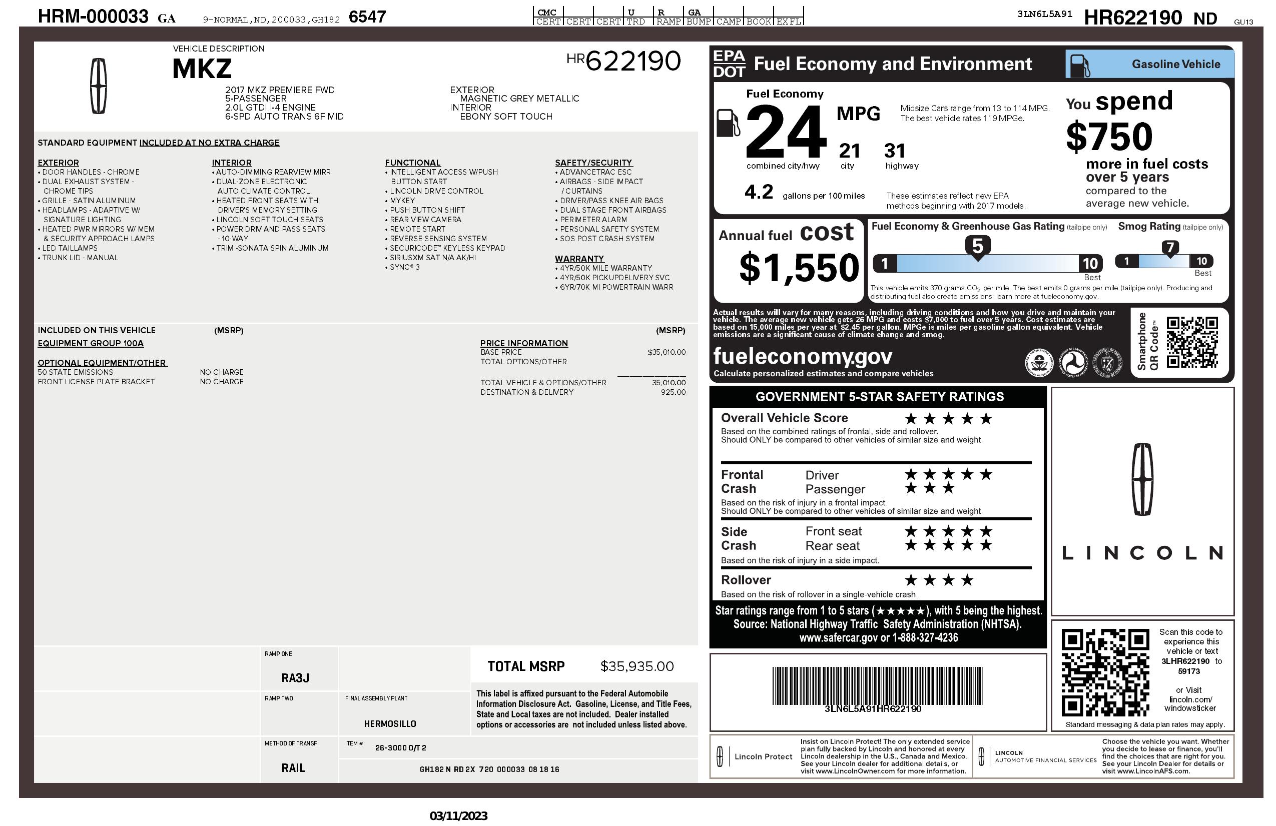 2017 Lincoln Mkz Premiere Fwd