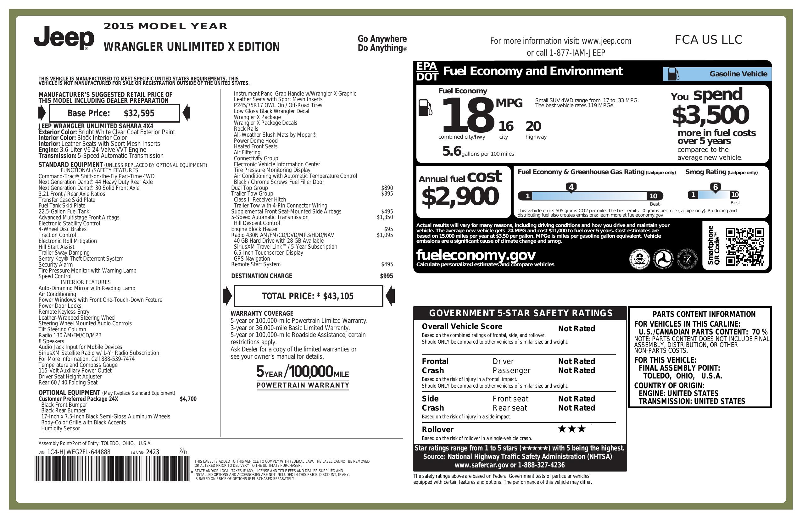 2015 Jeep Wrangler Unlimited 4 Wd 4dr Wrangler X *Ltd Avail*