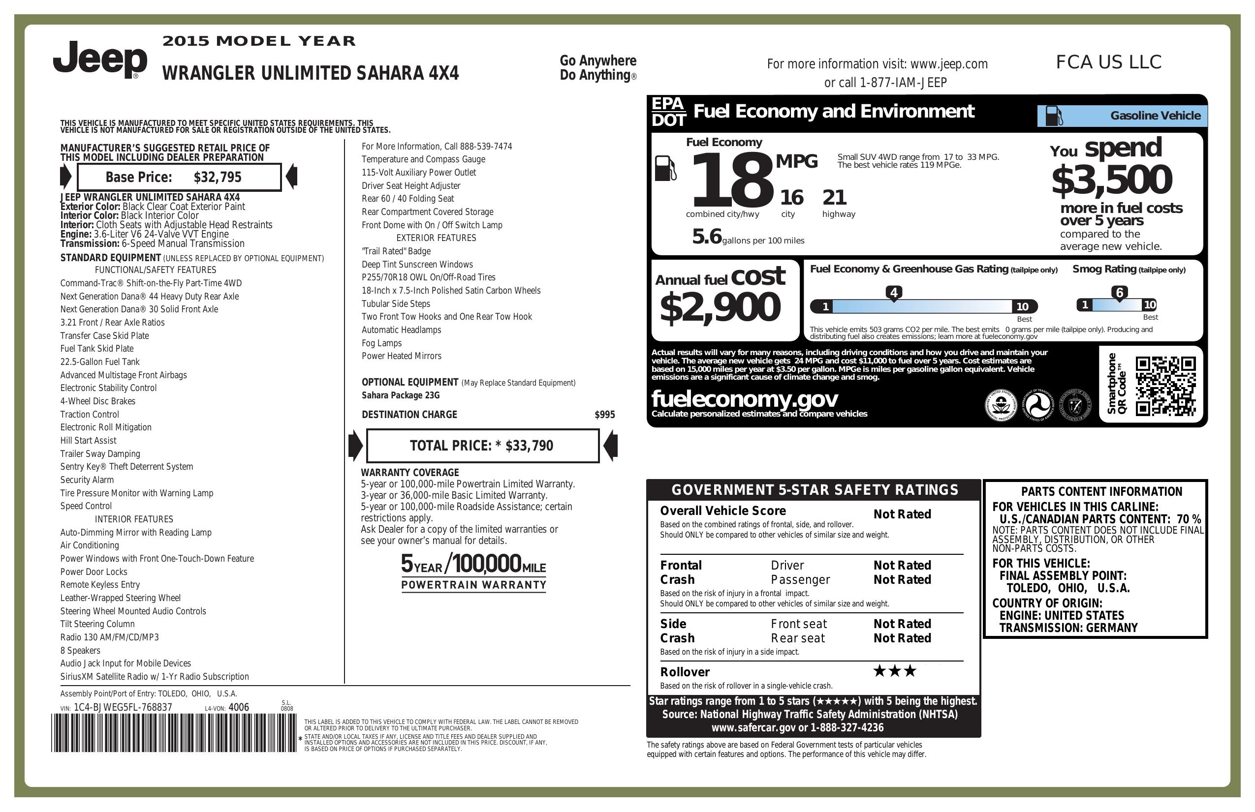 2015 Jeep Wrangler Unlimited Unlimited Sahara 4 Wd