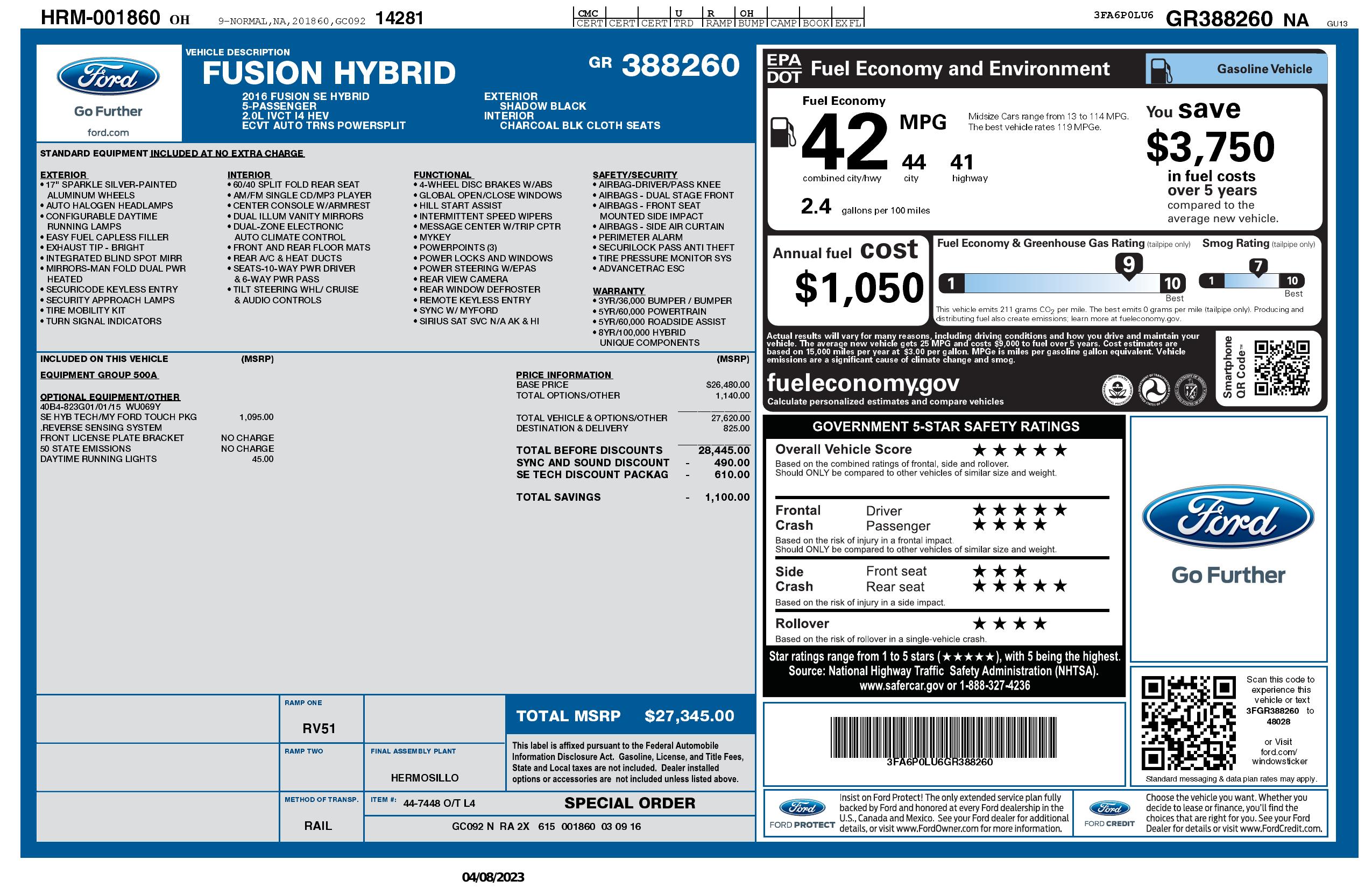 2016 Ford Fusion 4dr Sdn Se Hybrid Fwd