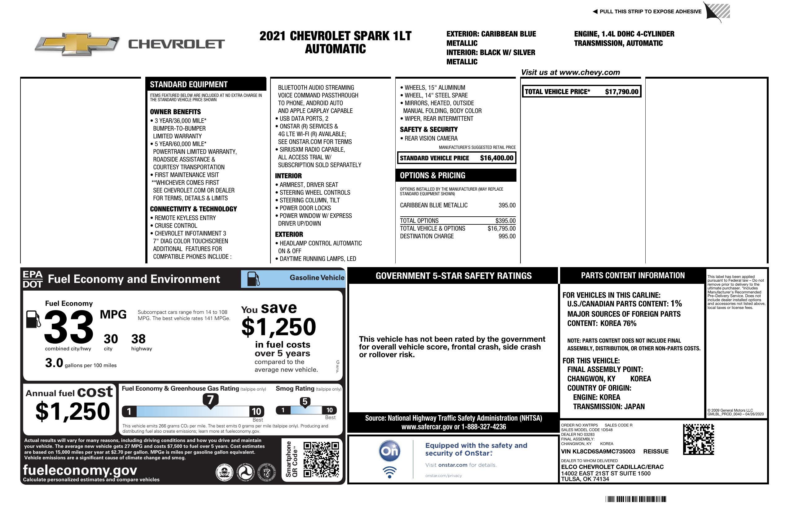 2021 Chevrolet Spark 1 Lt Hatchback 4 D