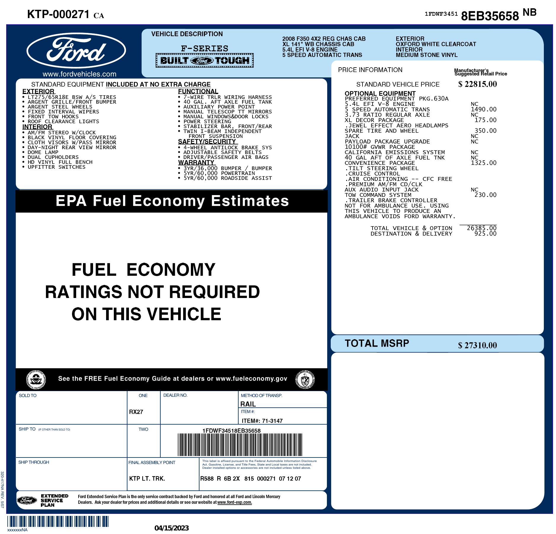 2008 Ford Super Duty F 350 Srw 2 Wd Reg Cab 141" Wb 60" Ca