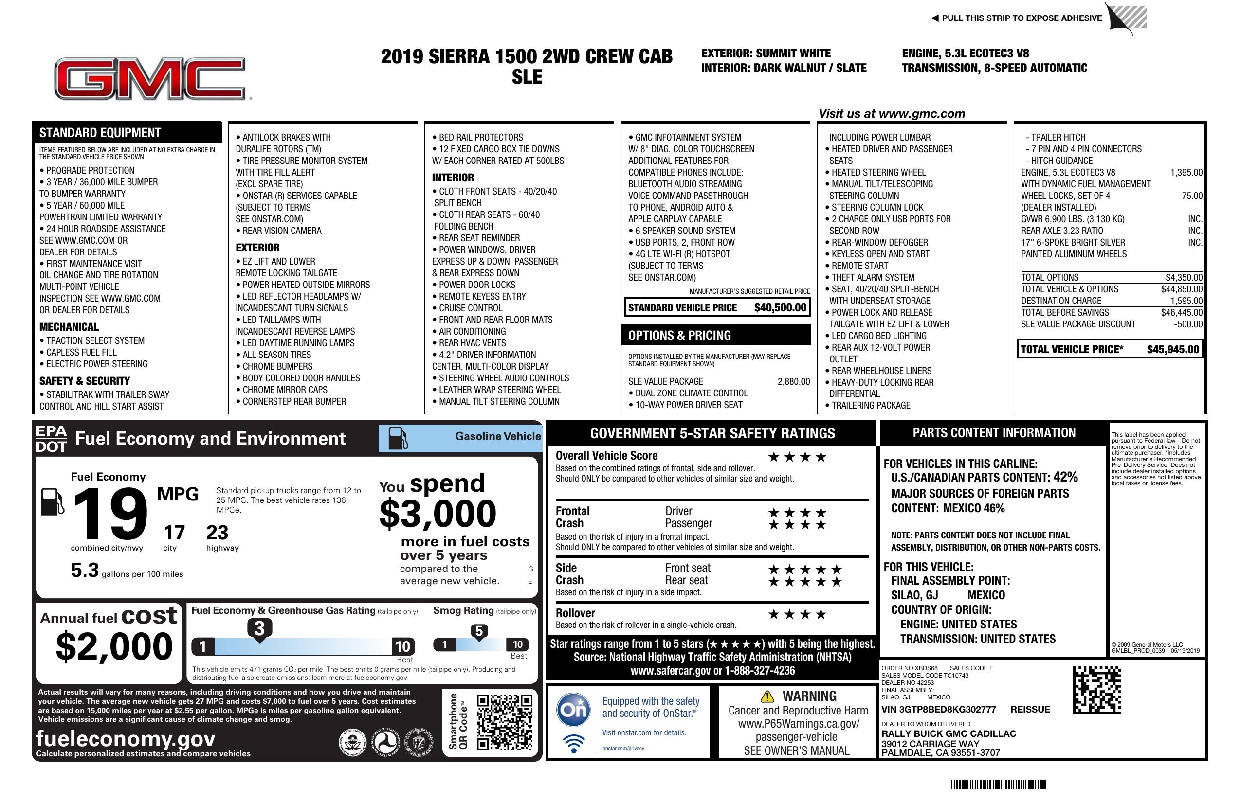 2019 GMC Sierra 1500 2 Wd Crew Cab 157" Sle