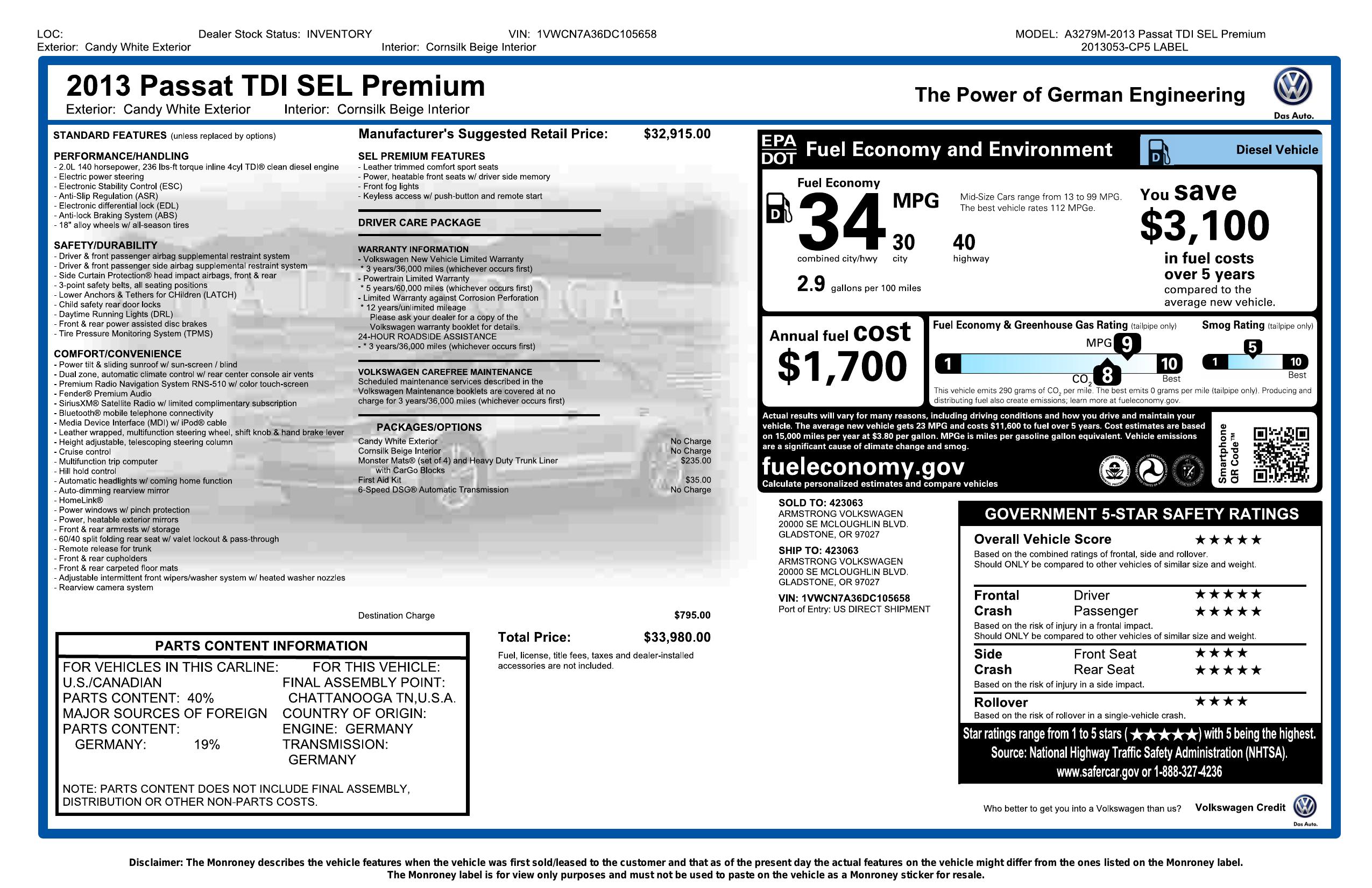 2013 Volkswagen Passat 4dr Sdn 2.0 L Dsg Tdi Sel Premium