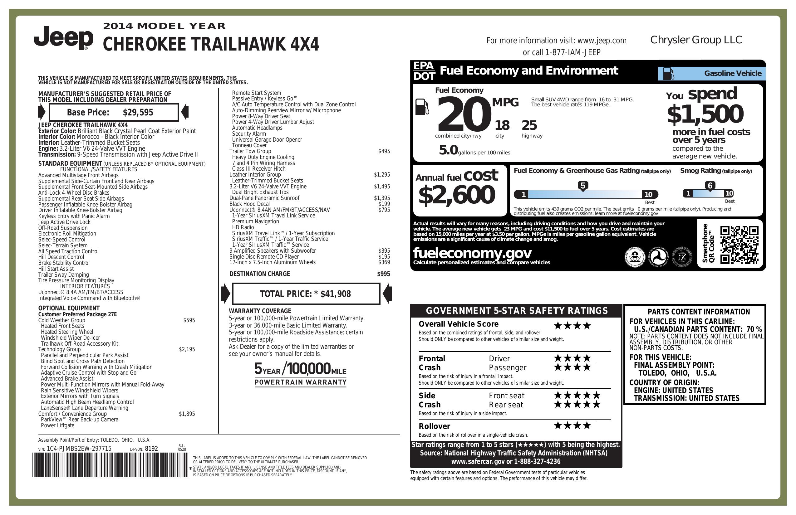 2014 Jeep Cherokee 4 Wd 4dr Trailhawk