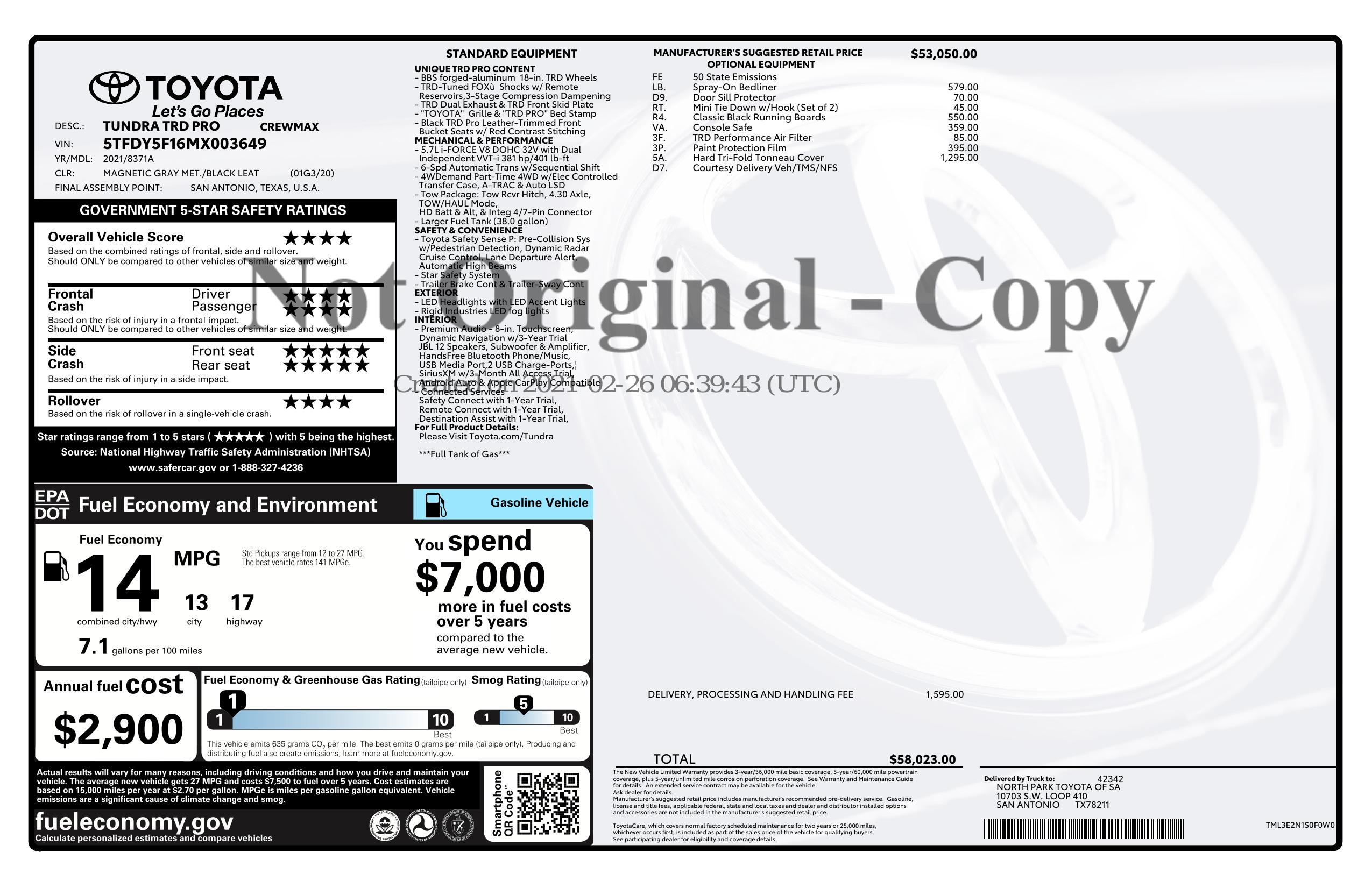 2021 Toyota Tundra 4 Wd Crew Max 5.5' Bed 5.7 L (Natl)
