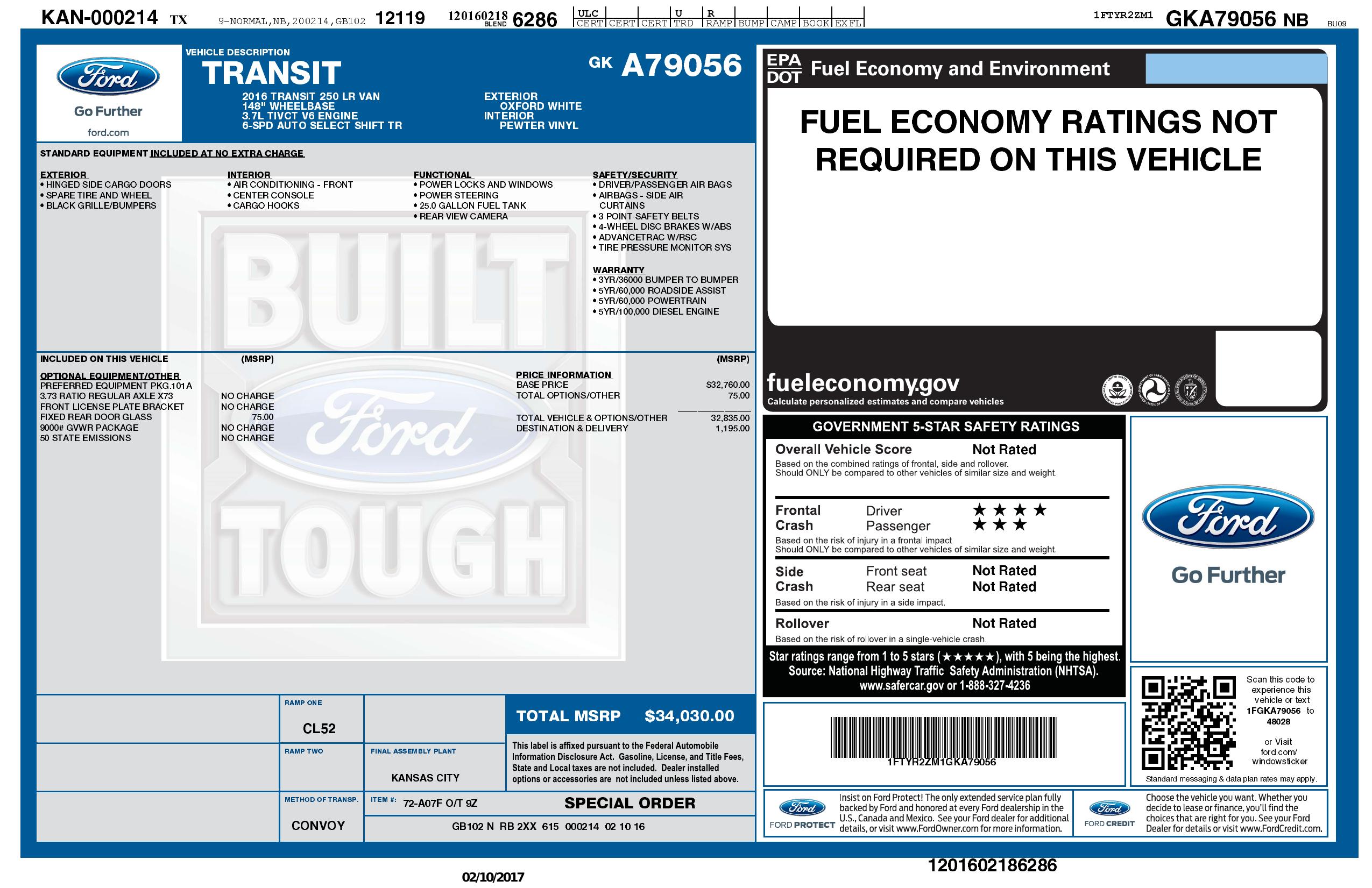 2016 Ford Transit Cargo Van T 250 148" Low Rf 9000 Gvwr Swing Out Rh Dr