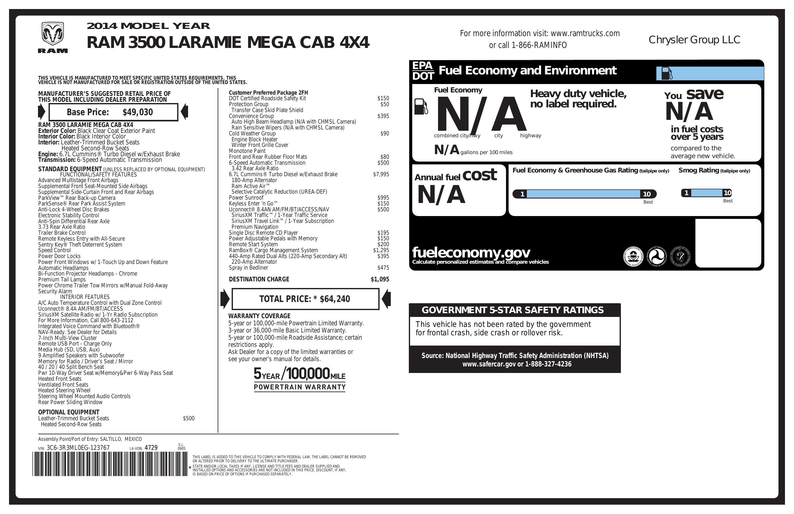 2014 Ram 3500 4 Wd Mega Cab 160.5" Laramie