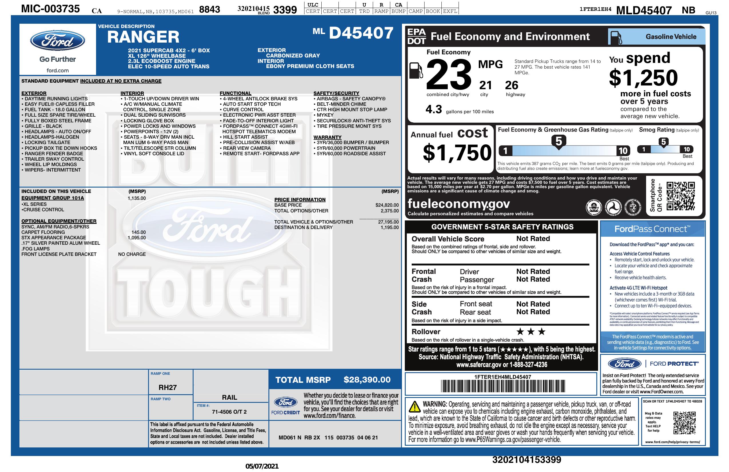 2021 Ford Ranger 2 Wd Super Cab 6' Box