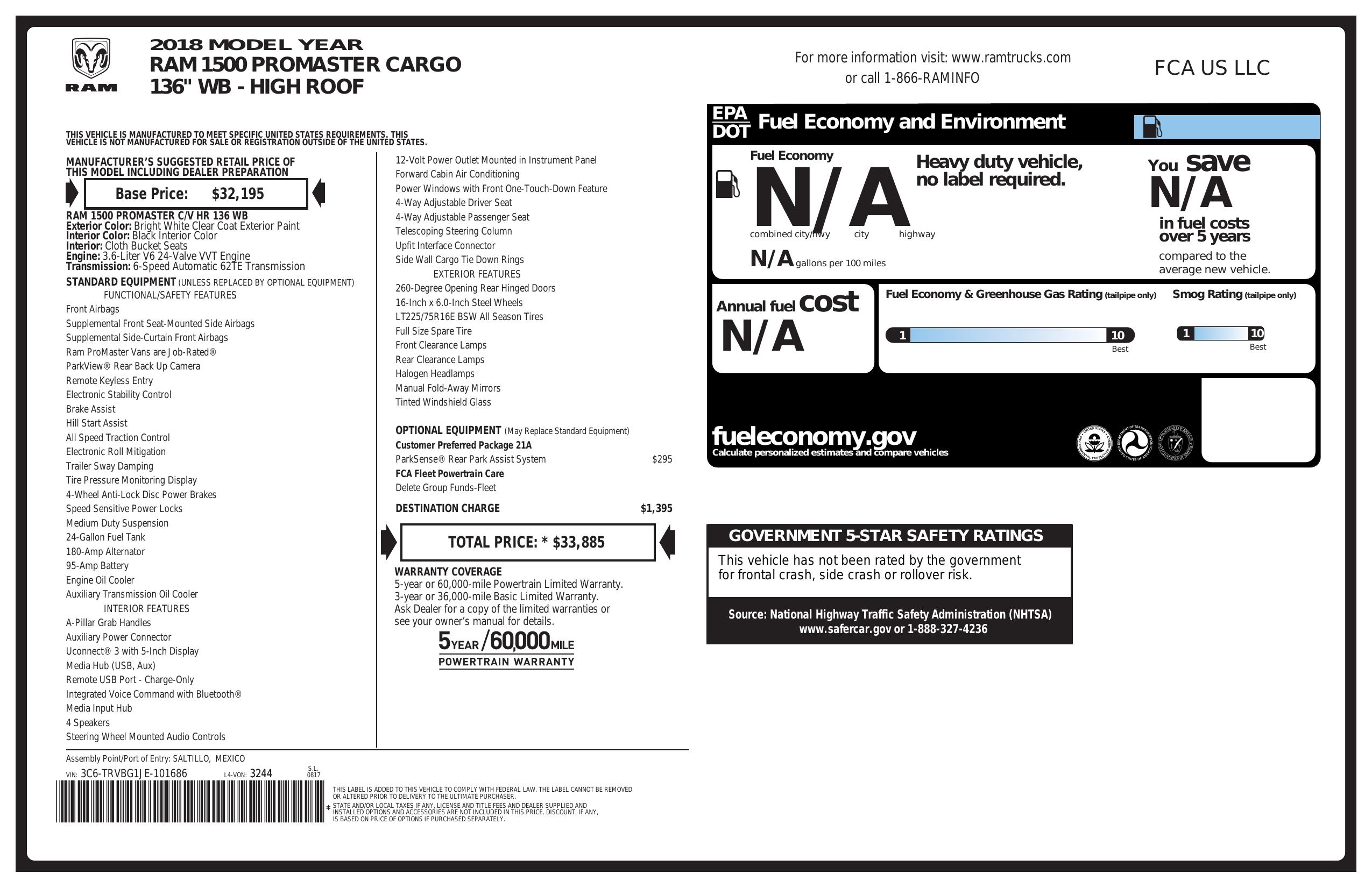 2018 Ram Pro Master Cargo Van 1500 High Roof 136" Wb