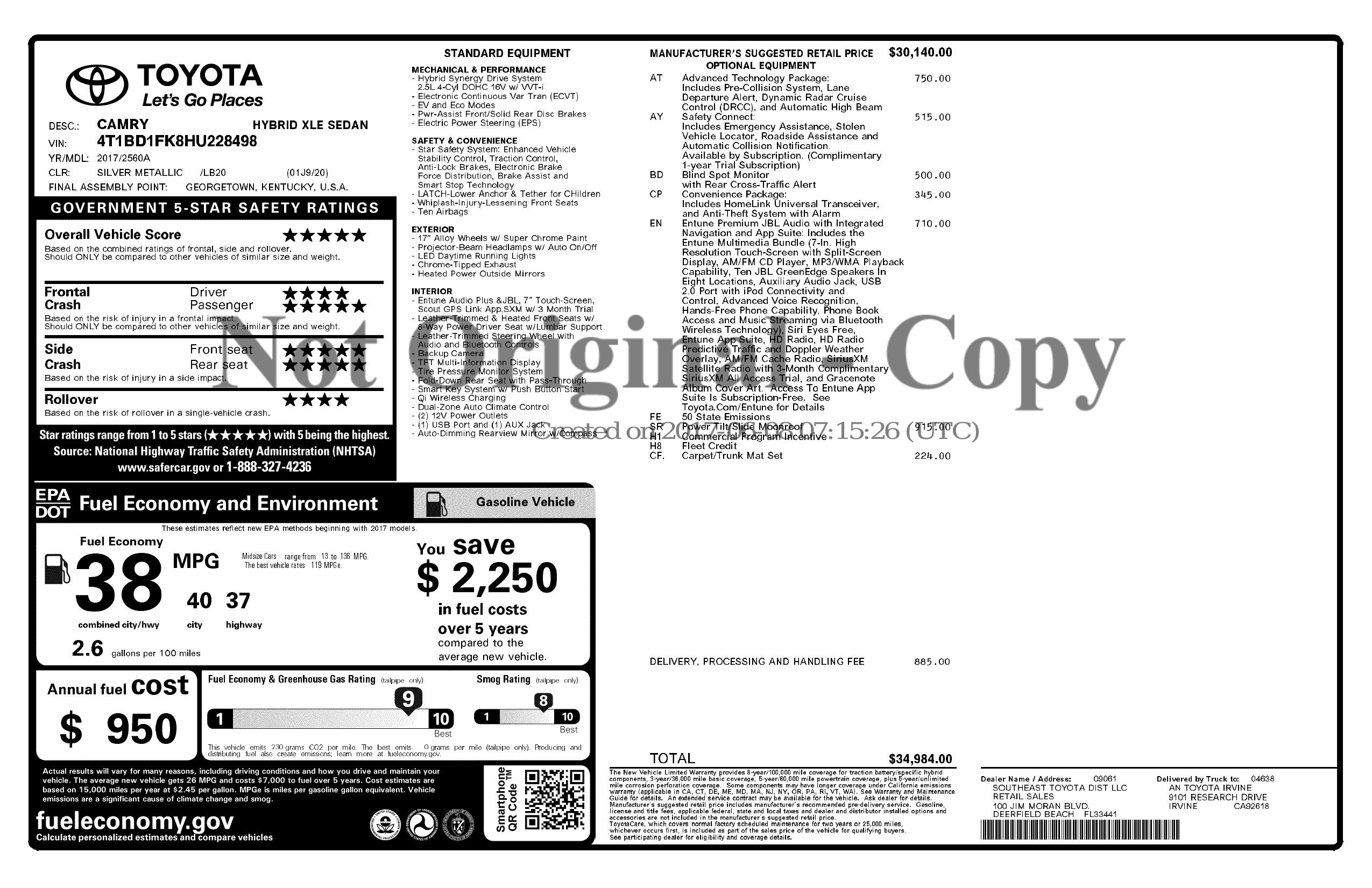 2017 Toyota Camry Hybrid Cvt (Natl)
