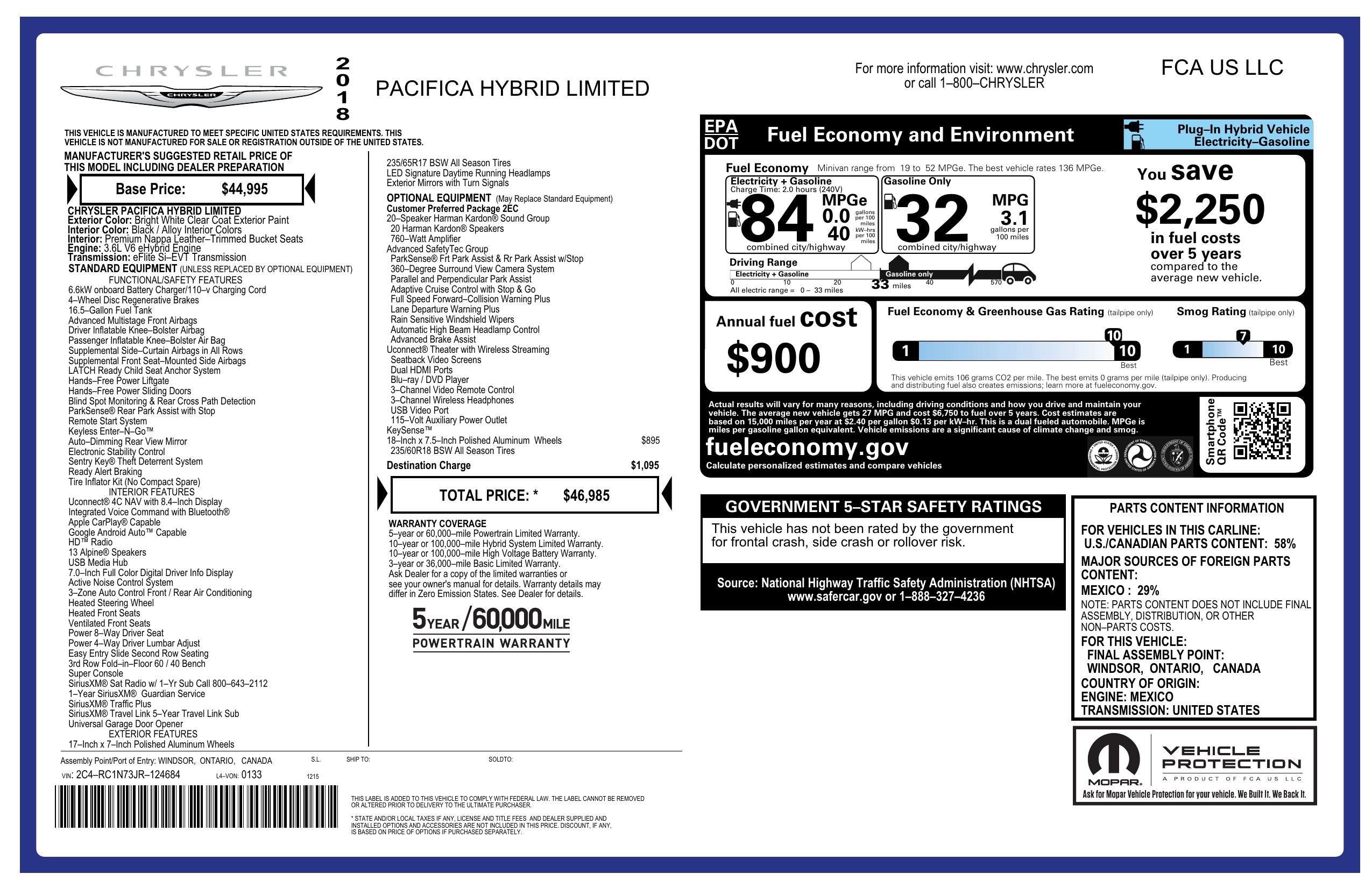 2018 Chrysler Pacifica Hybrid Limited Fwd