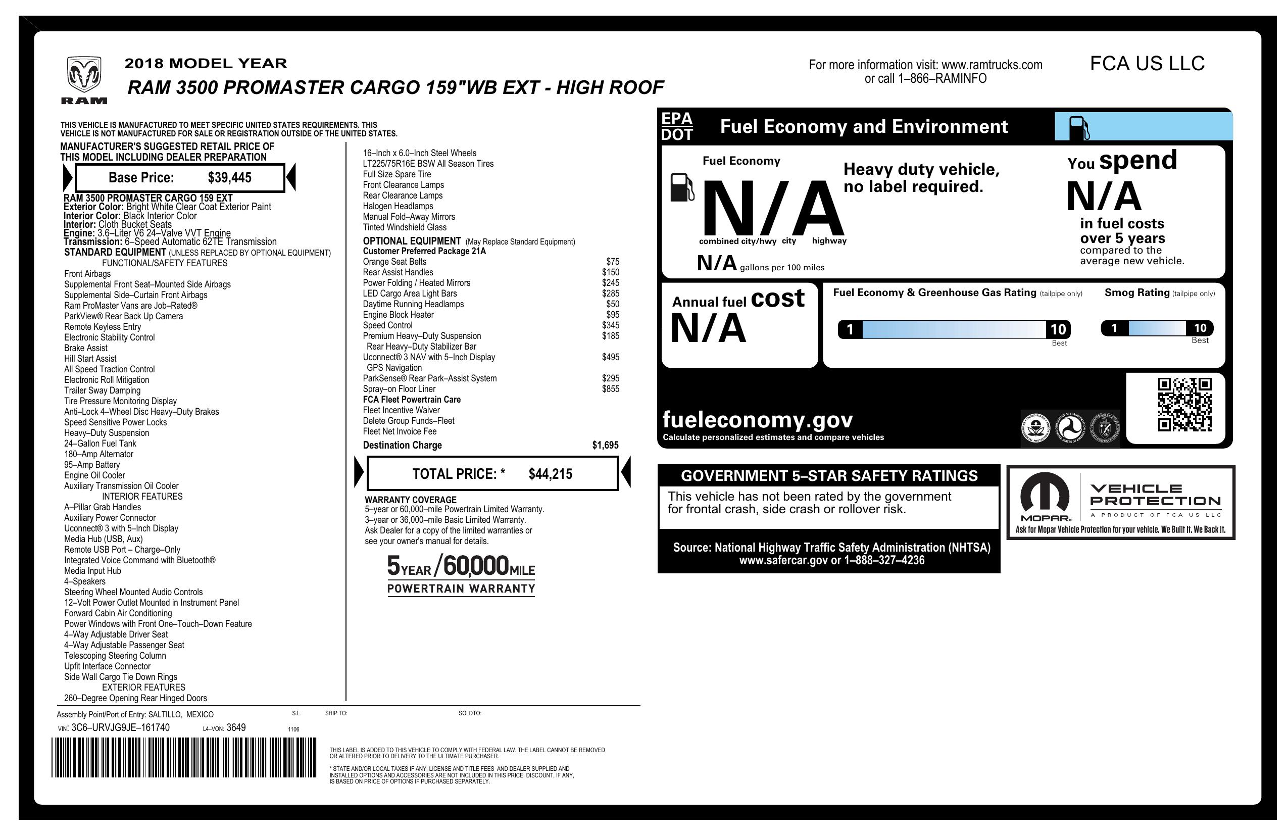 2018 Ram Pro Master Cargo Van 3500 High Roof 159" Wb Ext
