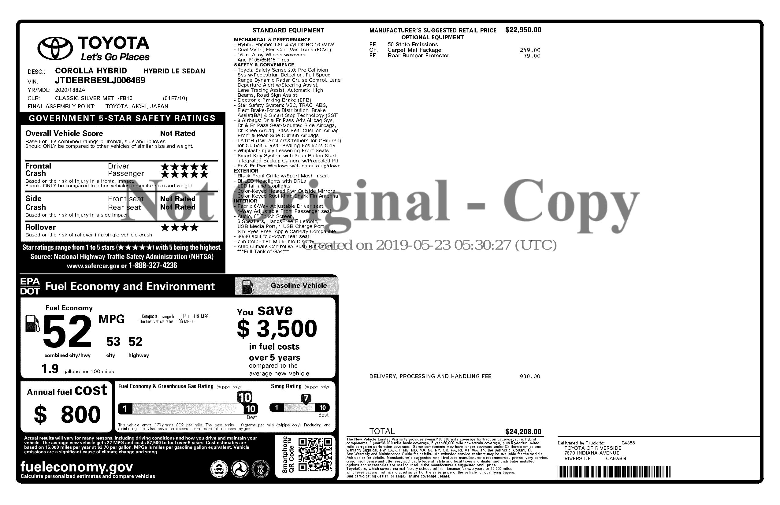 2020 Toyota Corolla Hybrid Le Cvt (Natl)