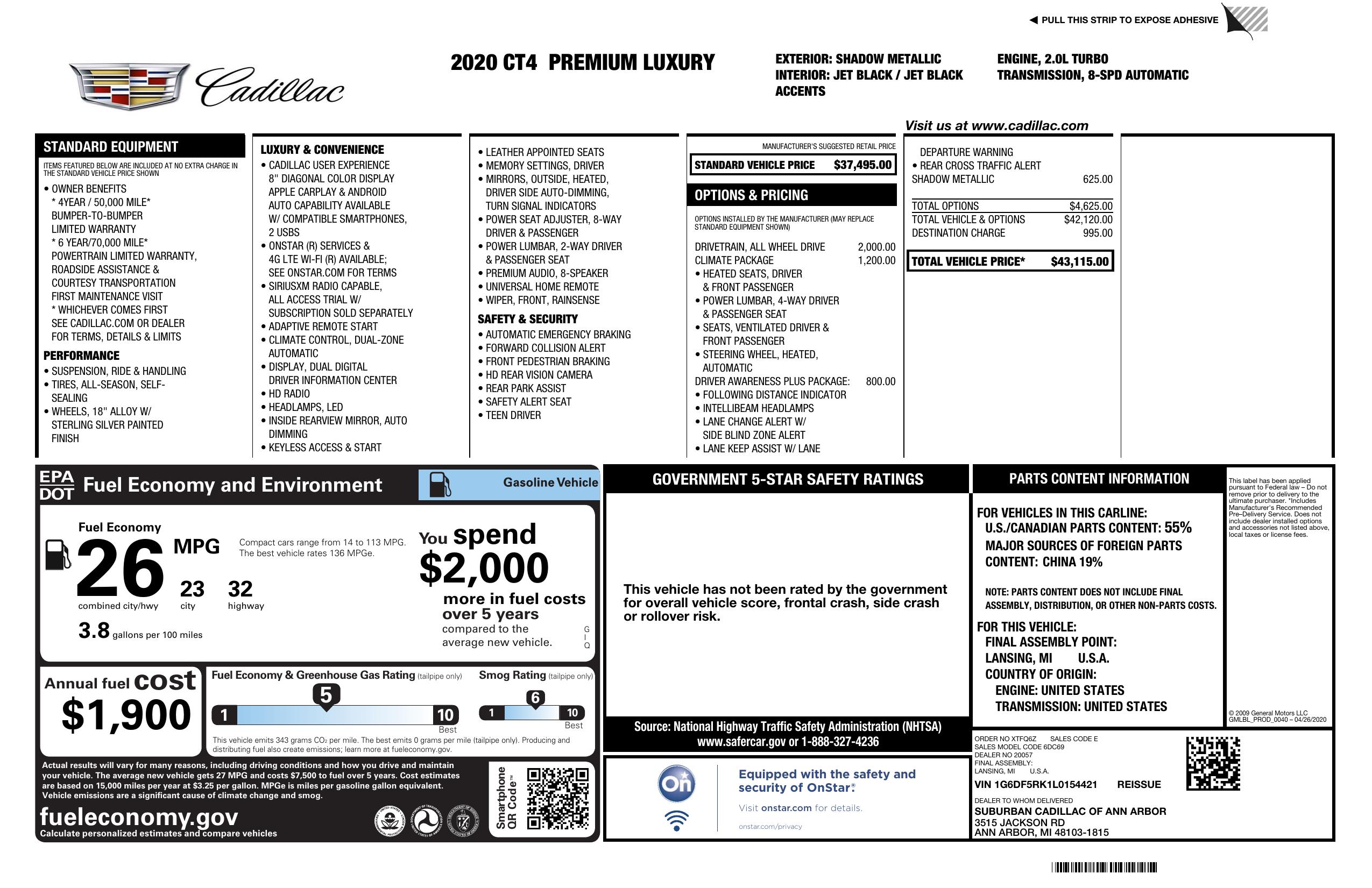 2020 Cadillac Ct4 4dr Sdn Premium Luxury